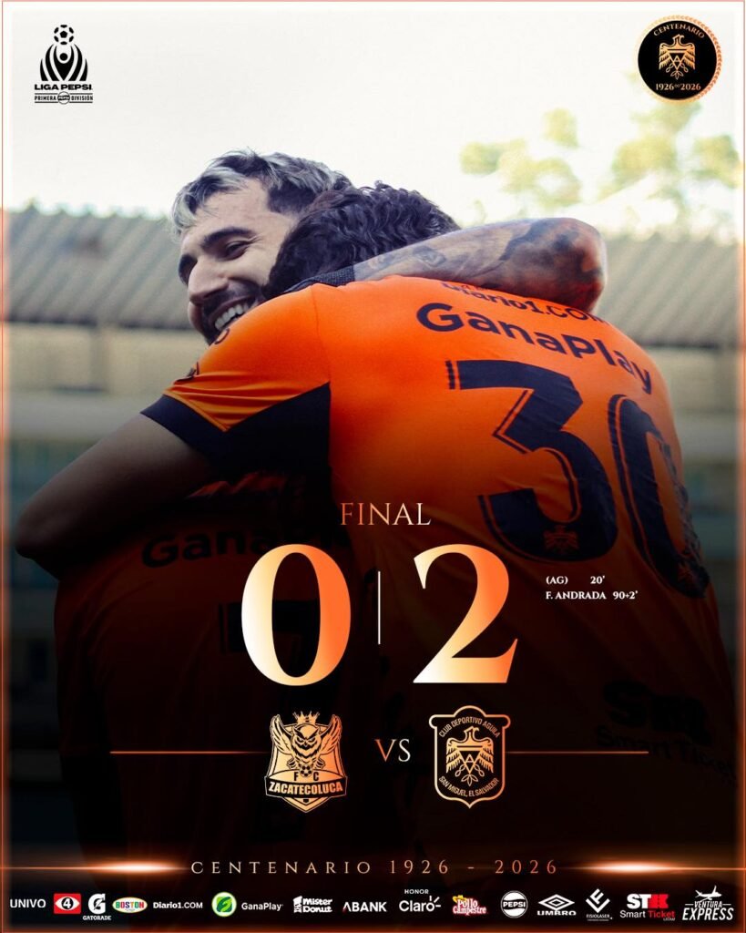 El Club Deportivo Águila celebró sus 100 años de historia de la mejor manera posible: con una victoria de 2-0 ante Zacatecoluca en el Estadio Cuscatlán. En el marco de la jornada siete del Clausura 2026, el conjunto migueleño festejó su siglo de vida sumando tres puntos vitales que lo catapultaron al cuarto lugar de la tabla, igualando a FAS con 15 unidades.