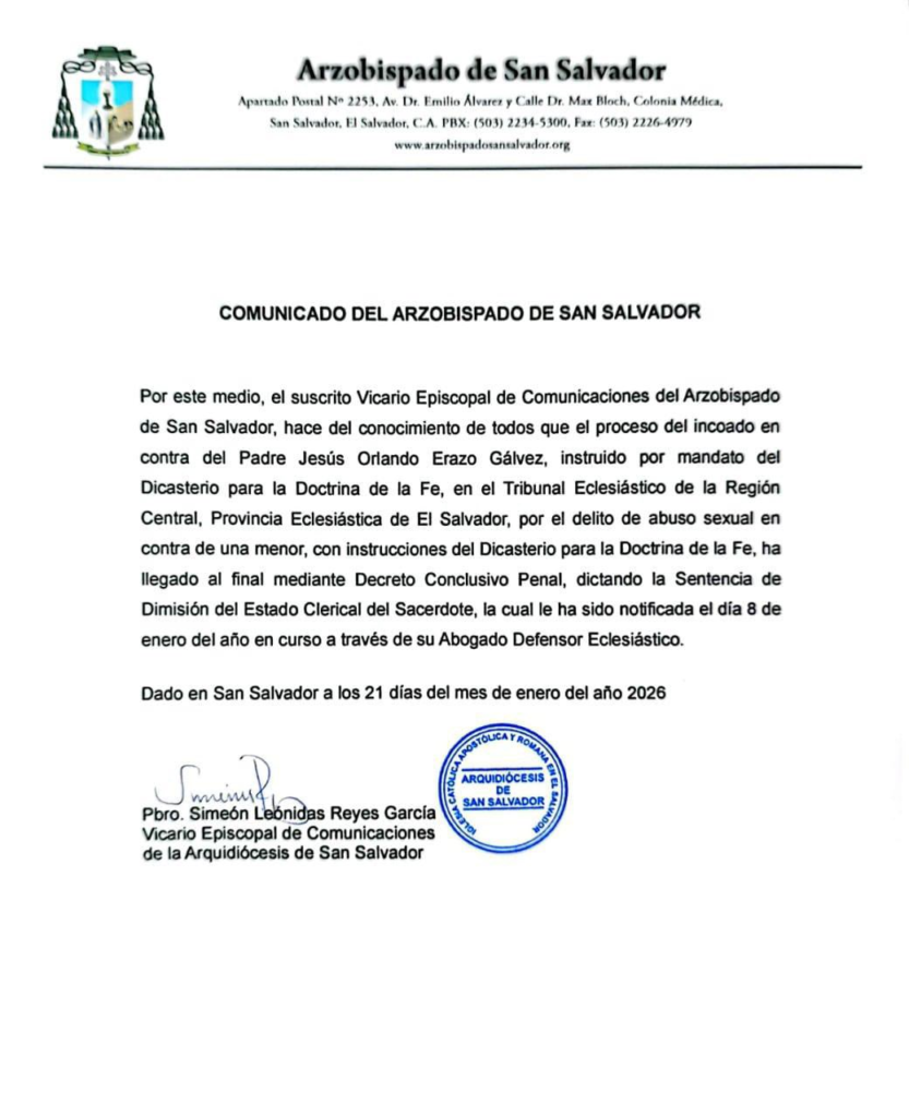 El proceso fue instruido bajo el mandato del Dicasterio para la Doctrina de la Fe y desarrollado en el Tribunal Eclesiástico de la Región Central. Según el comunicado emitido el 21 de enero de 2026, la resolución final quedó plasmada en un Decreto Conclusivo Penal, cerrando así un caso que afecta profundamente a la comunidad católica salvadoreña.