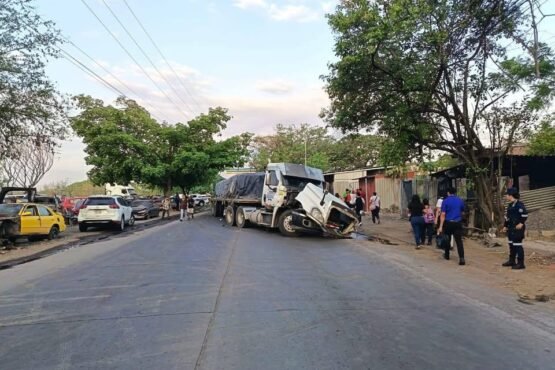 Desde la madrugada de este viernes, la ciudad de San Miguel experimentó un fuerte colapso vial tras un choque frontal entre una rastra cargada y un vehículo sedán placas P 740289. El percance ocurrió en el sector del puente Luis de Moscoso, un punto neurálgico que conecta la ciudad con