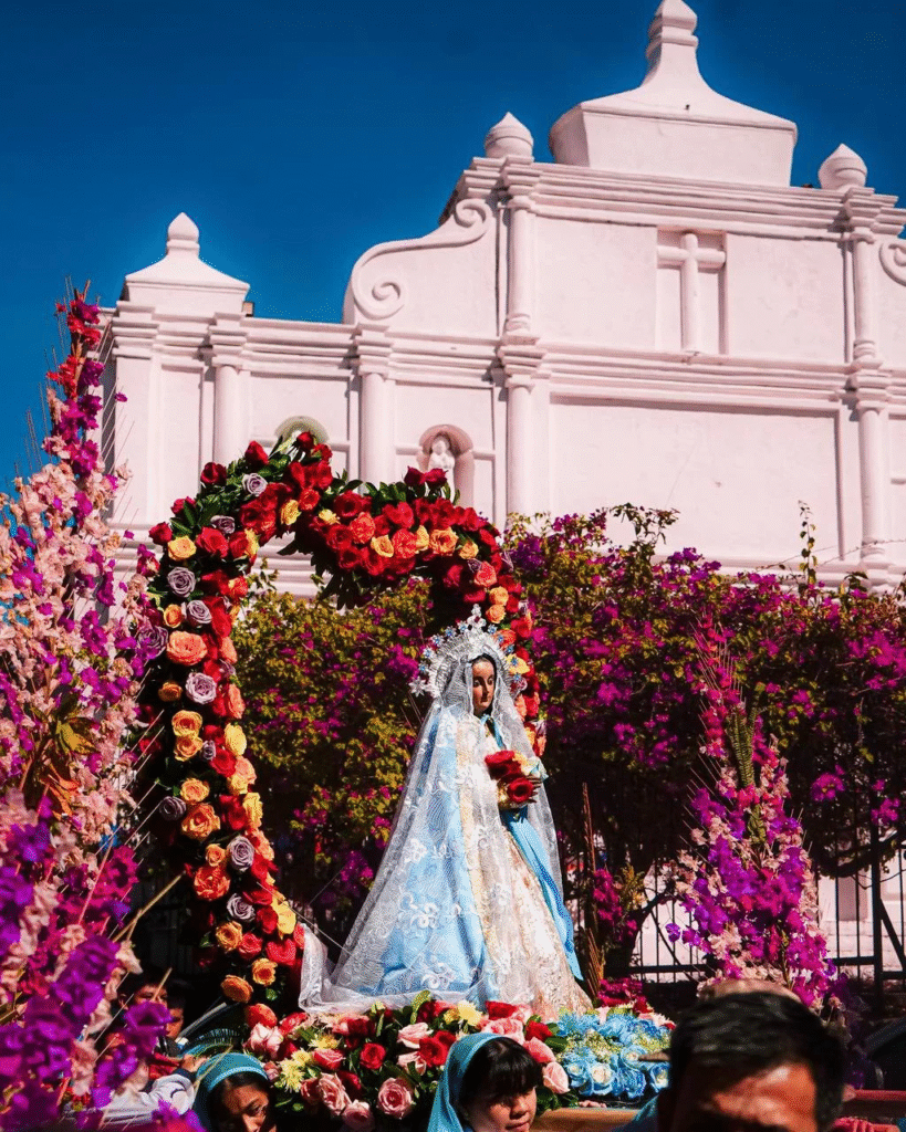Durante los festejos, este trabajo colectivo crea un vibrante camino de devoción que acompaña el recorrido de las imágenes de la Virgen del Rosario y la Virgen Inmaculada. El evento combina espiritualidad, color y organización comunitaria, teniendo como eje central a la histórica iglesia de Panchimalco.