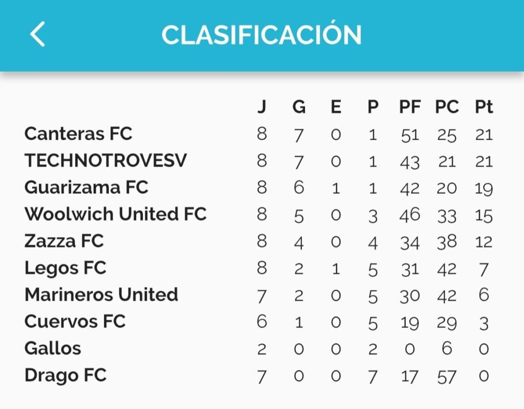 Tras ocho jornadas disputadas, Canteras FC y TECHNOTROVESV comparten el liderato con 21 puntos, ambos con siete victorias y una sola derrota.