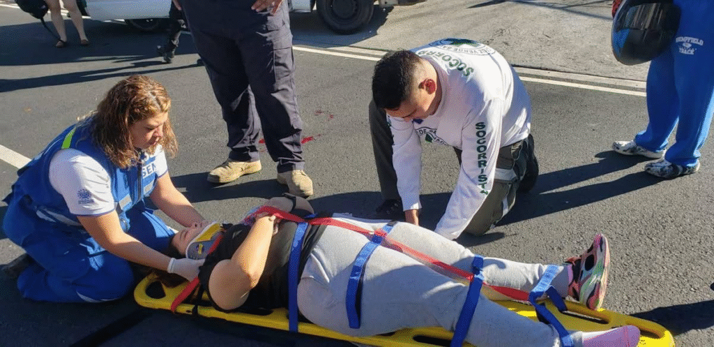 Un fuerte accidente de tránsito dejó a dos personas gravemente lesionadas este jueves en la avenida Bernal, en San Salvador. Según el informe preliminar de Cruz Verde, el percance ocurrió cuando un vehículo particular realizó un giro indebido sobre una doble línea amarilla, justo en el instante en que una motocicleta circulaba por la vía principal, provocando un impacto frontal que lanzó a los ocupantes de la moto varios metros sobre el pavimento.
