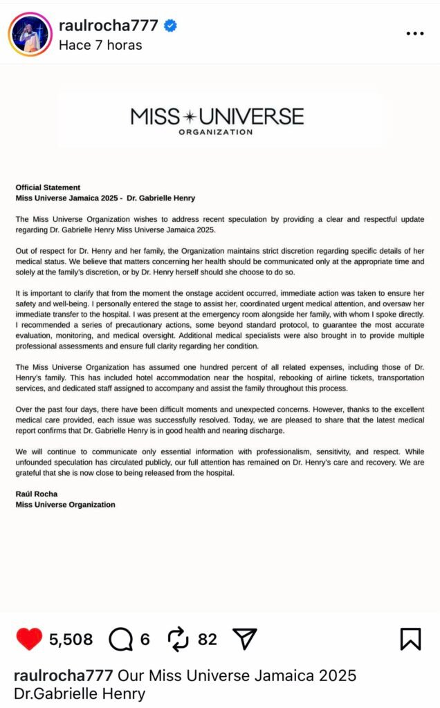 El presidente y copropietario de la Organización Miss Universo (MUO), Raúl Rocha, rechazó de manera categórica las acusaciones de fraude en la reciente coronación de Fátima Bosch como Miss Universo 2025. En un comunicado publicado en sus redes sociales, Rocha aseguró que las especulaciones son “completamente falsas e imposibles”.