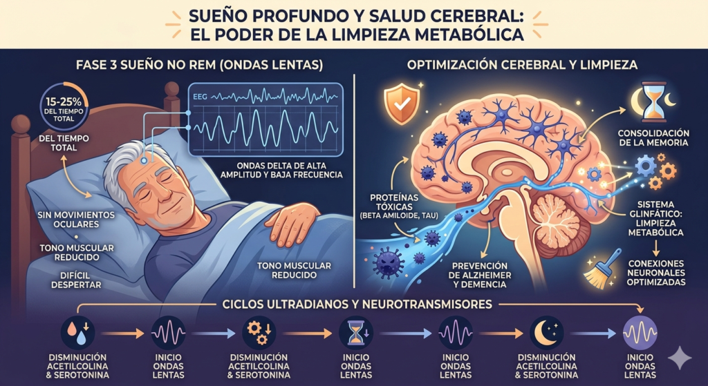 El sueño de ondas lentas, identificado como la etapa 3 del sueño no REM, es el pilar fundamental del descanso reparador. En los adultos mayores, la reducción de esta fase se ha vinculado estrechamente con un mayor riesgo de desarrollar enfermedades neurodegenerativas. Durante este periodo, la actividad cerebral se manifiesta a través de ondas delta de alta amplitud, mientras el cuerpo experimenta una relajación muscular total y la desaparición de los movimientos oculares.