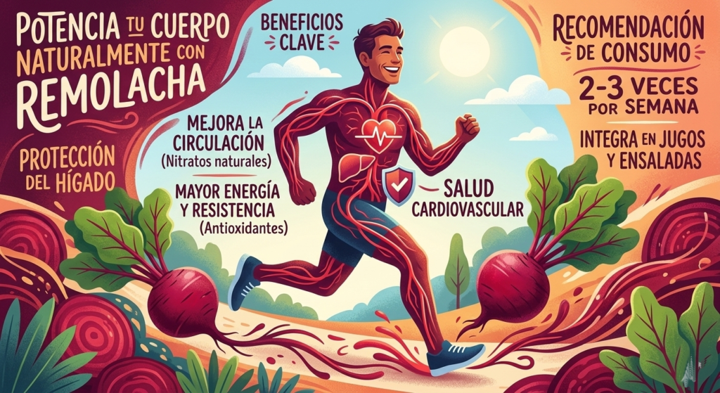 Esta conversión ayuda a dilatar los vasos sanguíneos, mejorando la circulación y ayudando a reducir la presión arterial de forma natural. Además, su consumo está estrechamente ligado al rendimiento deportivo, ya que optimiza el uso del oxígeno durante el ejercicio físico, permitiendo una mayor resistencia. También es una aliada del hígado, pues contiene betalaínas que facilitan la desintoxicación y protegen las células del estrés oxidativo.