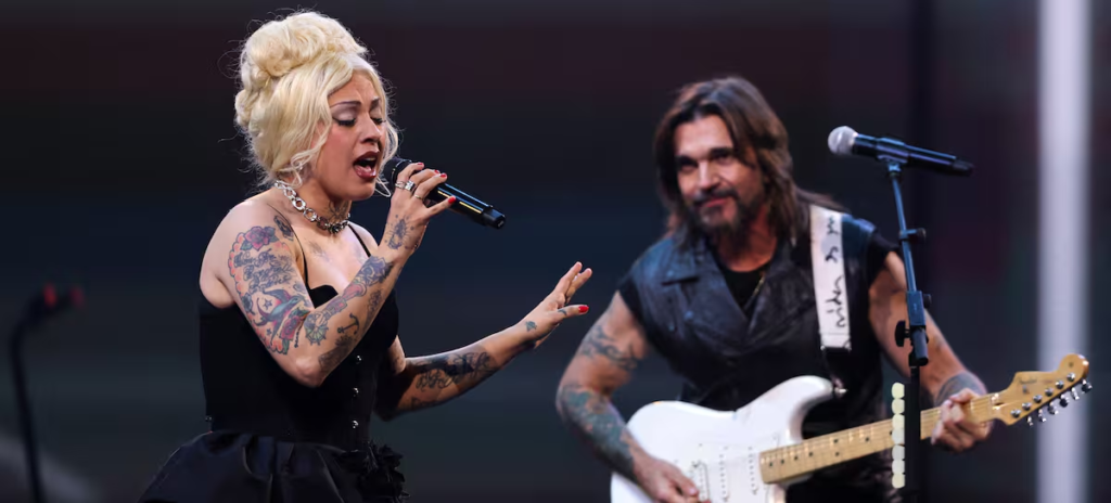 Los cantantes mexicanos Jesse Huerta (izq.) y Joy Huerta, del dúo pop Jesse & Joy, se presentan en el escenario durante la 65ª edición del Festival Internacional de la Canción de Viña del Mar en Viña del Mar, Chile, el 24 de febrero de 2026. / JAVIER TORRES