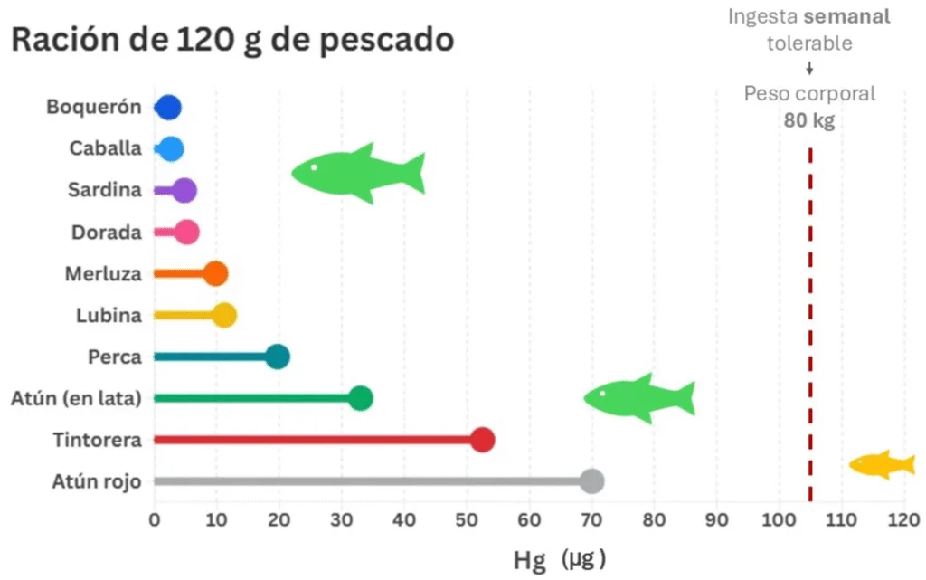 Seguridad frente al mercurio, un estudio español: 98,8 % muestras por debajo del límite máximo; 26,6 % sin detección. Riesgo solo en consumo excesivo de grandes depredadores (pez espada, tiburón). El selenio contrarresta la toxicidad.