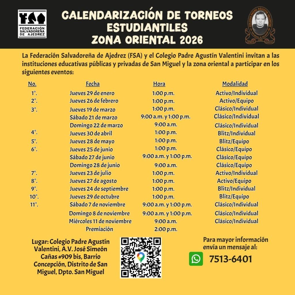 La Federación Salvadoreña de Ajedrez continúa impulsando con firmeza la descentralización de este deporte ciencia, enfocando sus esfuerzos en potenciar el talento de los jóvenes en la zona oriental del país. Gracias a una alianza estratégica con el Colegio Padre Agustín Valentini, se están desarrollando jornadas de promoción y competencia que buscan llevar la práctica del ajedrez a más instituciones educativas fuera de la capital.