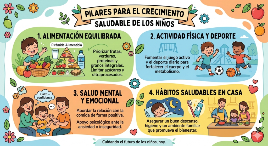 - Actividad Física: El deporte no solo quema calorías; regula el metabolismo, fortalece el sistema óseo y mejora la sensibilidad a la insulina, beneficios que protegen al niño al llegar a la adultez.