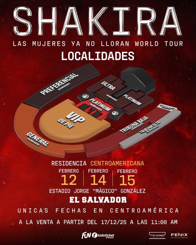 Shakira ha confirmado una «residencia centroamericana» en El Salvador como parte de su gira mundial Las Mujeres Ya No Lloran. El país ha sido elegido como la única parada en Centroamérica, consolidándose como un epicentro regional para la gira.